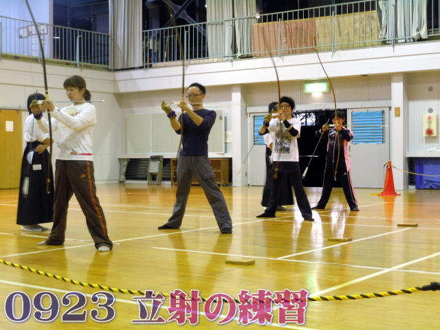 今日は立射の的前練習です。弓を保持したまま矢番えをするのは大変な様子です。